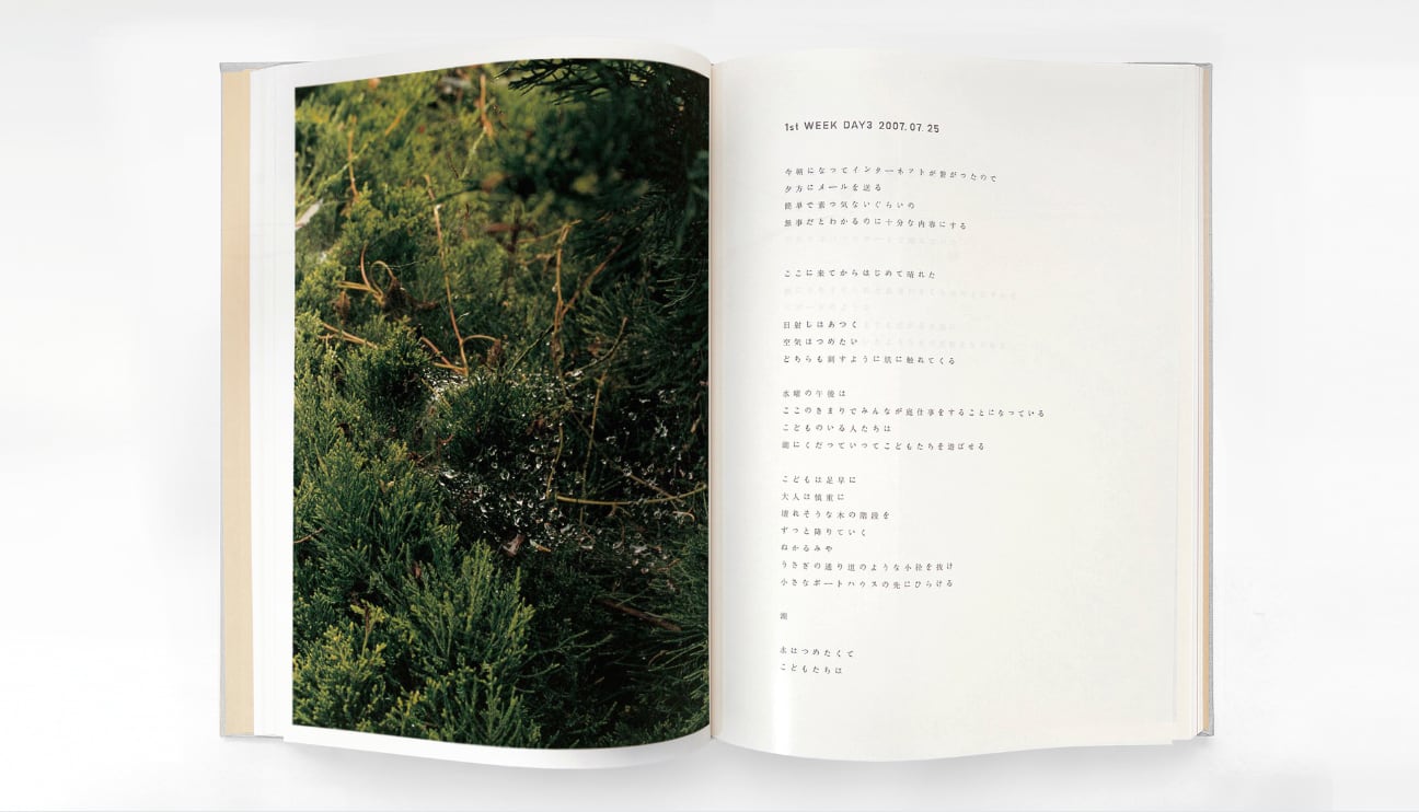 これらの写真は、長島の亡くなった祖父の家から見つかった、25年ほど前に祖母が撮影し、箱に大切にしまっておいた花の写真にインスパイアされたもので、Village Nomadeの敷地内の草花や、部屋の光景、伴っていた息子などが写されている。 また、スイスの澄んだ空気の中で生まれた写真と言葉をそのまま束ねたスクラップブックのように、写真ページ、テキストページ、クラフトペーパーがランダムに綴じられ、 航空券のしおりやメモ書きも挟み込まれる。